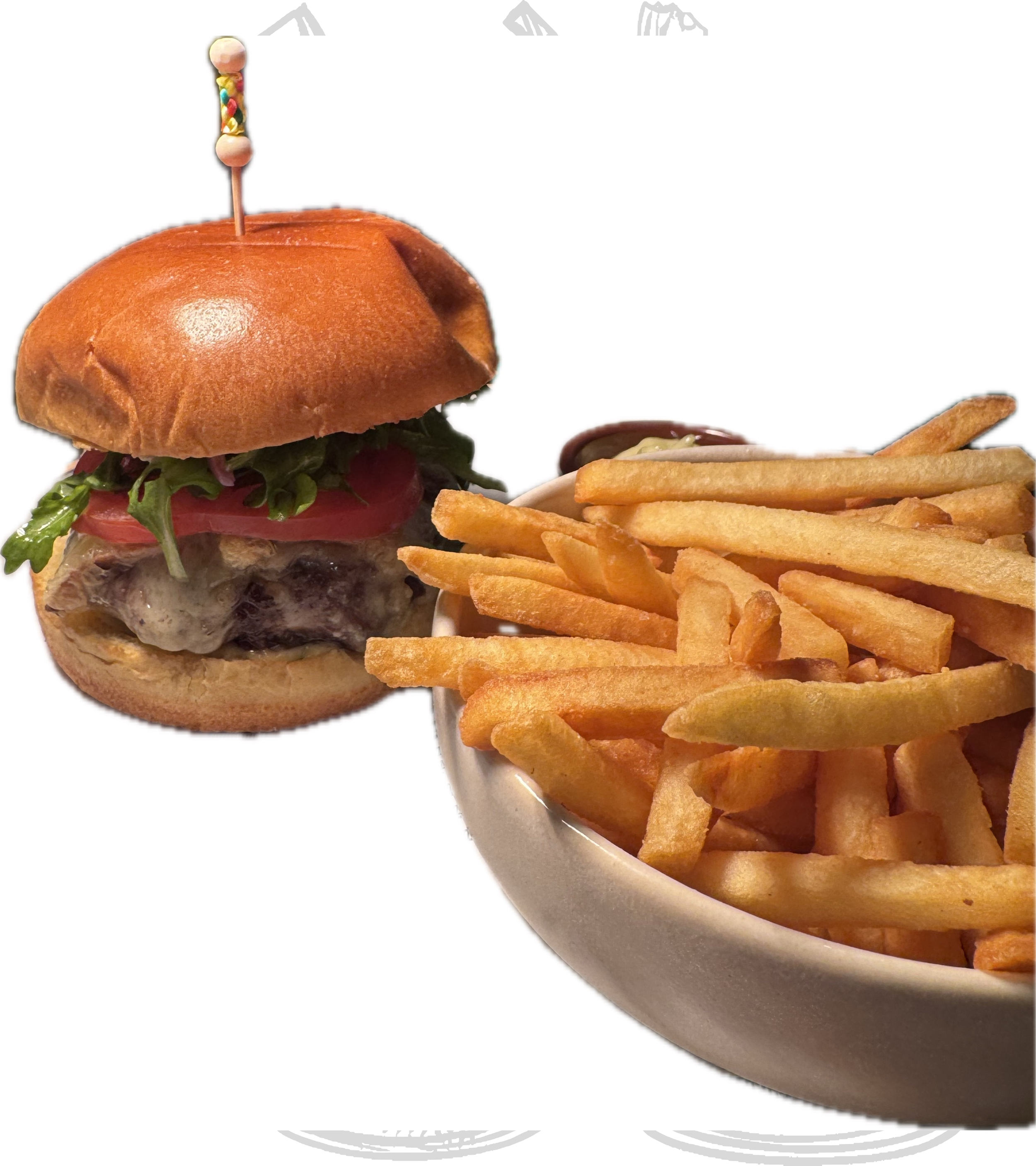 Burger Night at Lucien. 200gr beef Wagyu burger, aioli tomato, salad, pickles. Served with french Fries